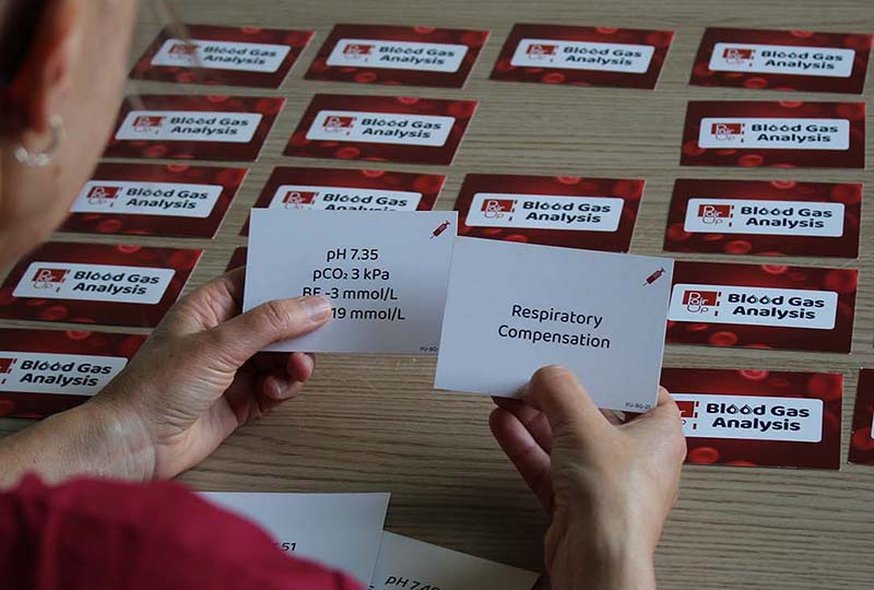 Pair Up works like the “memory game”. Players discuss how components of blood gas results are inter-related. One player needs a good understanding of the topic to act as a facilitator.