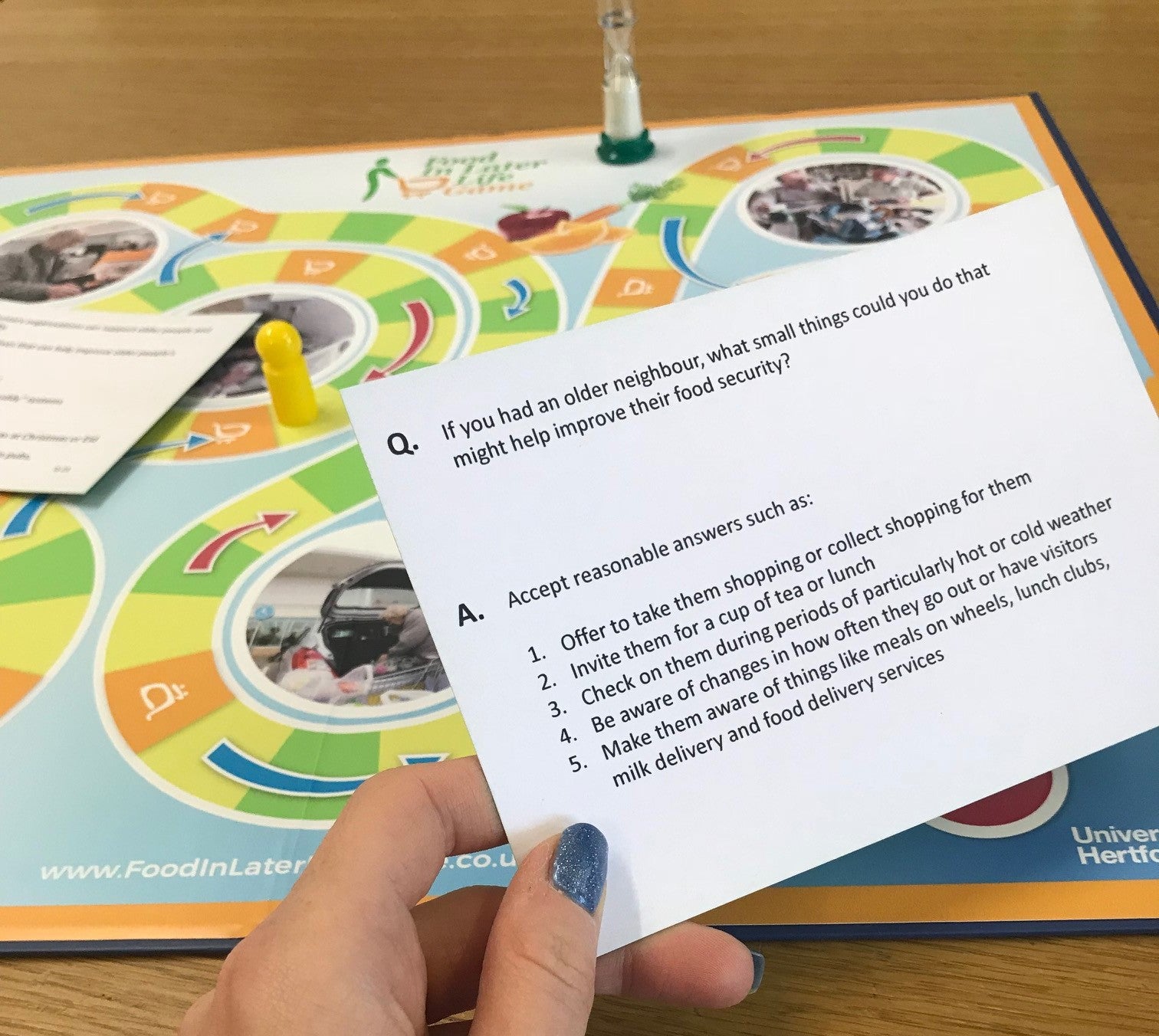 The game uses question cards to help players understand what makes an older person food insecure and think about how we can ensure older people continue to enjoy the food they want to eat. Scenario cards ask players to identify issues faced by an older person in a particular situation and think about how the issues could be overcome.