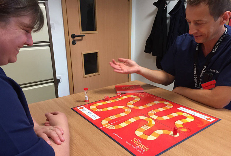 The Sepsis Game is a unique way of bringing staff together to discuss the challenges of sepsis, a condition which is everyone’s responsibility to recognise and manage. Two teams compete against each other, progressing round the board by providing answers to questions about sepsis. Answers are developed through discussions within the team, allowing players to explore each other’s perspectives, which is particularly useful for multidisciplinary team training.