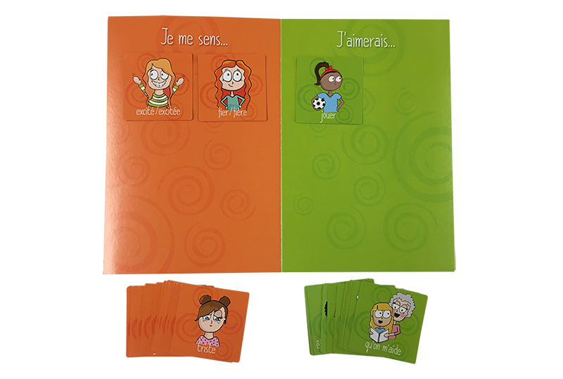 Les enfants commencent par placer les cartes « Je me sens » sur le côté gauche du plateau. Ils placent ensuite les cartes « J’aimerais » sur le côté droit du plateau.