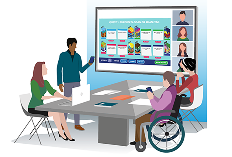 It works through a web browser. Up to 8 people participate for 90 minutes. Running a game session is very simple and anyone can do it. You just invite players to join the game through their browser, wherever they are. It is self-contained, self-directed and doesn’t need external support.