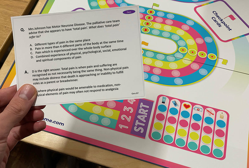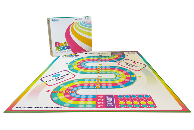 It is a competitive game for between 2-4 individuals or teams. Participants compete to move along a pathway depicting the end-of-life patient journey. Teams move forward by correctly answering and discussing questions about palliative and end of life care.